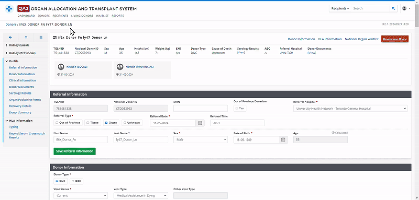 A donor profile contains information about a donor and the organs that are consented for recovery. OATS uses this information to allocate and offer consented organs to the most appropriate recipients from the Ontario waiting list and, in some cases, to recipients on national waiting lists.