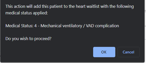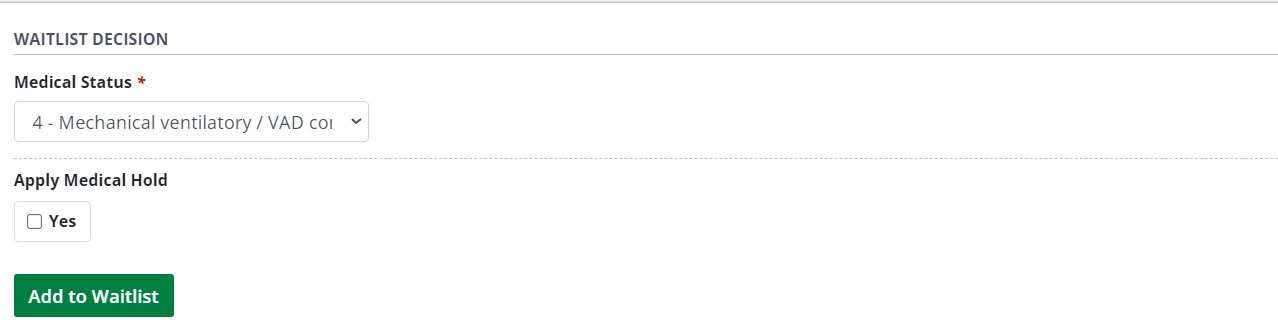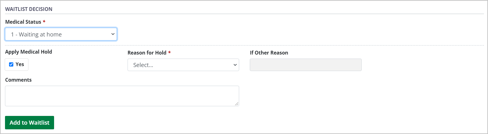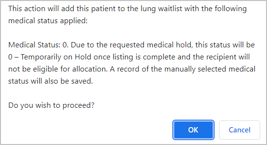 The Medical Status option 0 - Temporarily on hold is not selectable when adding a recipient to the waitlist. To waitlist a recipient and place them on medical hold, see Adding a recipient to a waitlist with a medical hold, below.