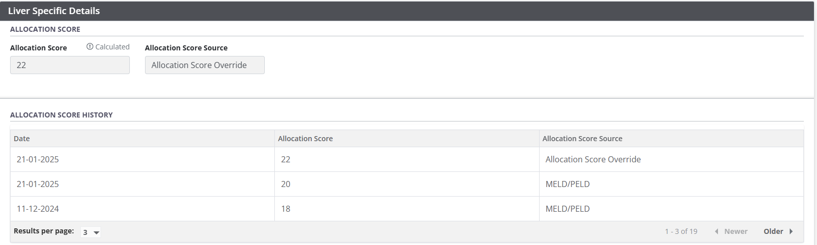 Other users of the system can view the history of Allocation Score changes and see the Allocation score override in the Liver specific details of a journey.