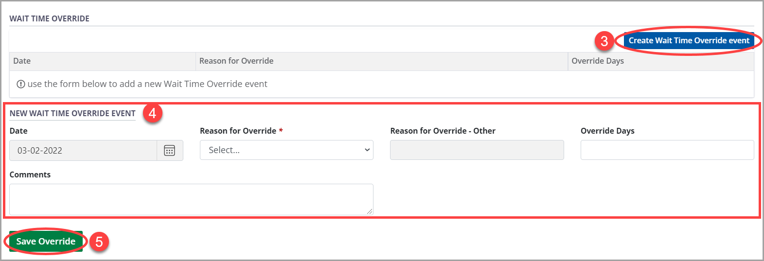 Enter information in the Waitlist Override form: