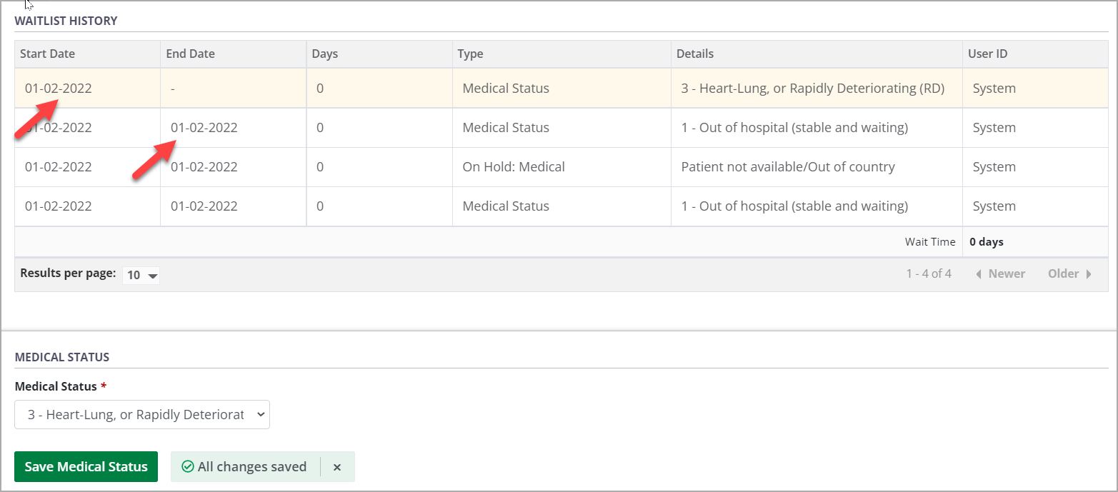 The system adds the newly selected medical status to the waitlist history table and end-dates the previous medical status row.