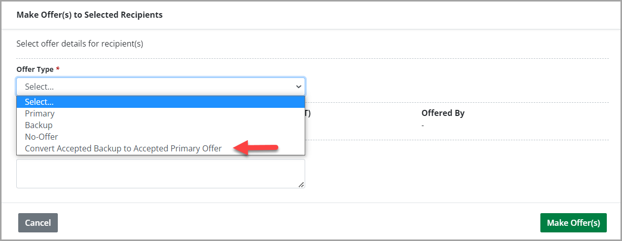 In the Make Offer(s) to Selected Recipients window that appears, select Offer Type of Convert Accepted Backup to Accepted Primary Offer.