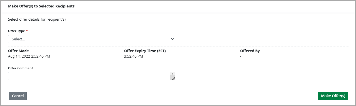 In the Make Offer(s) to Selected Recipients window that appears, enter the following information: