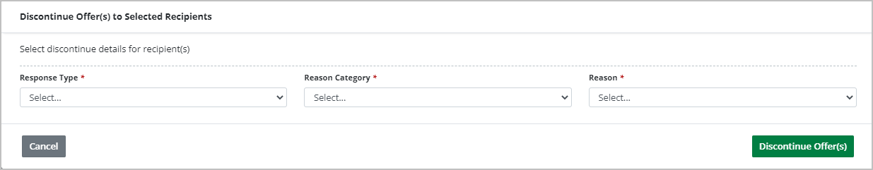 In the Discontinue Offer(s) to Selected Recipients window, provide values for
