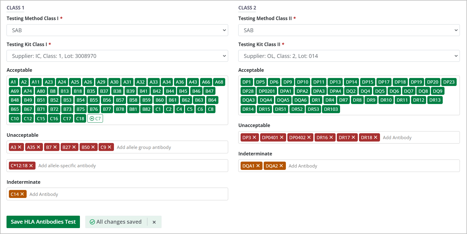 The system presents the SAB interface, listing all of the antibodies that can be included in your test results, divided into Class I and Class II antibodies.