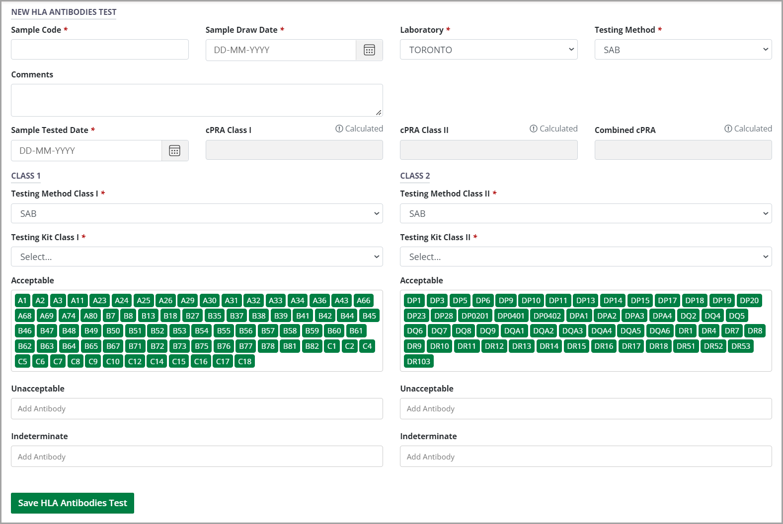 In the New HLA Antibodies Test fields: