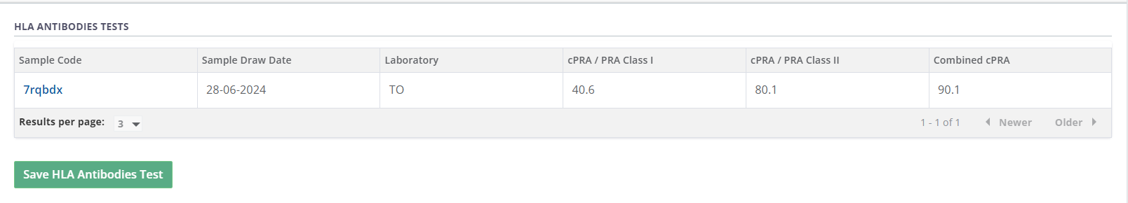 When you have completed entering the antibody results, select the Save HLA Antibodies Test button.
