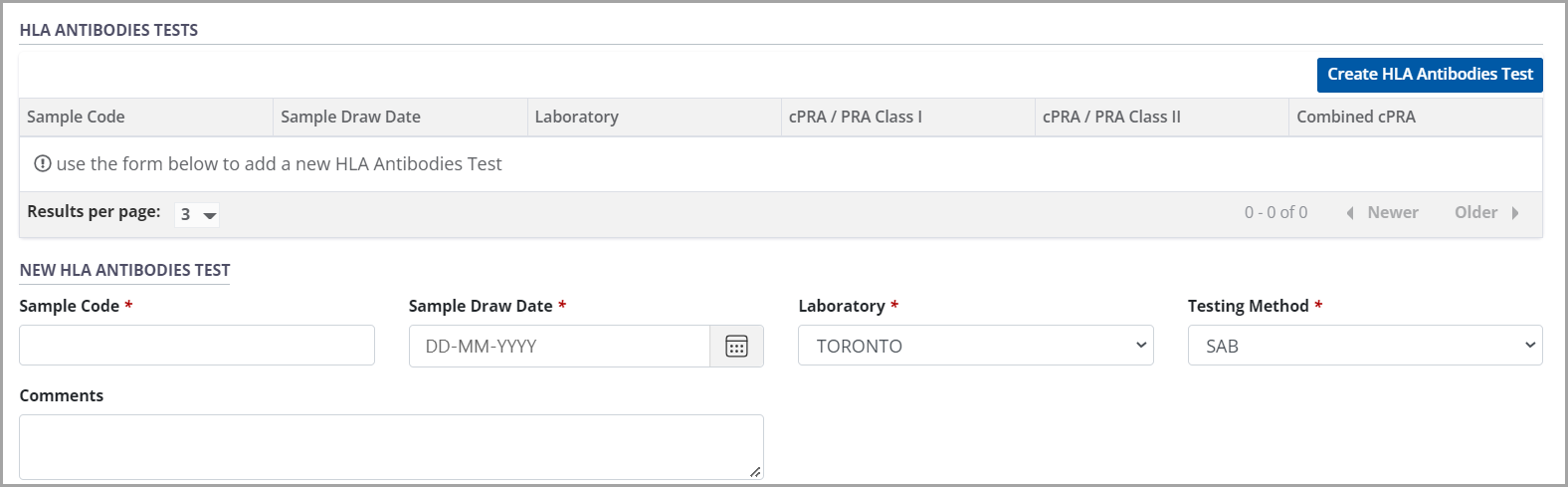 Select the HLA Lab where the sample was tested, and enter the testing date (defaulted to today’s date) and any comments about the test results.