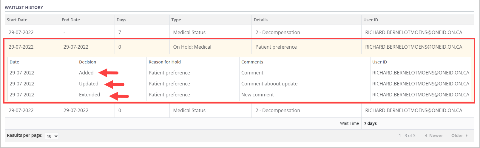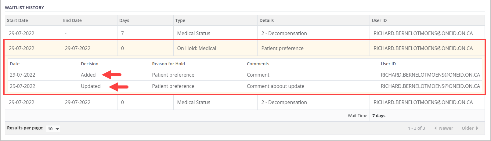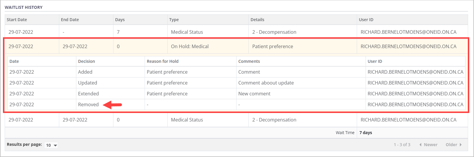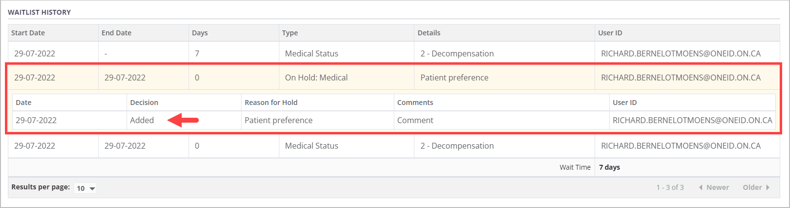 Details of changes made to the medical hold over time can be viewed by selecting the expandable medical hold row within the waitlist history table.