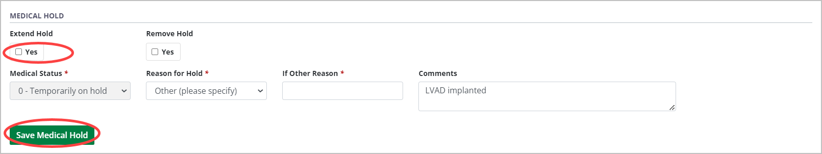 Enter the relevant medical hold information in the fields that appear: Reason for Hold, If Other Reason (if applicable) and Comments.