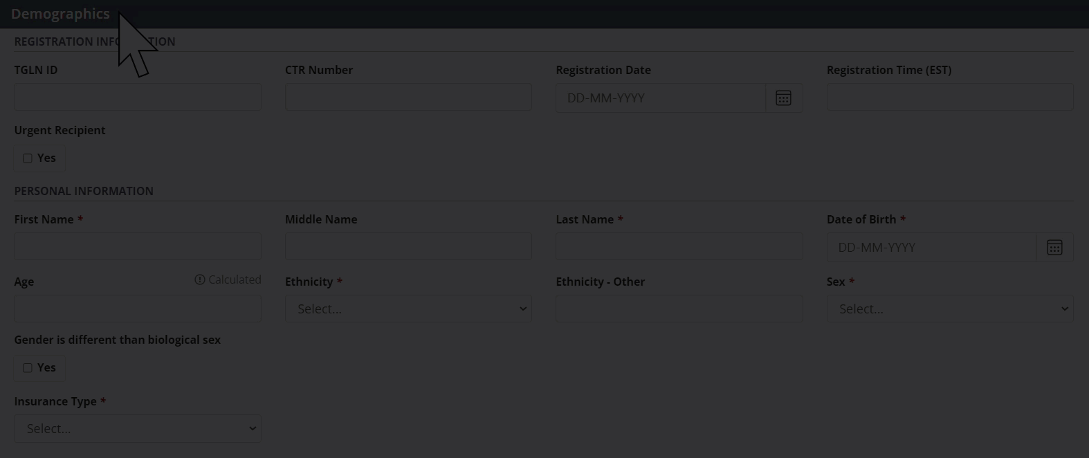 On a new recipient profile, you add demographic information in the blank form.