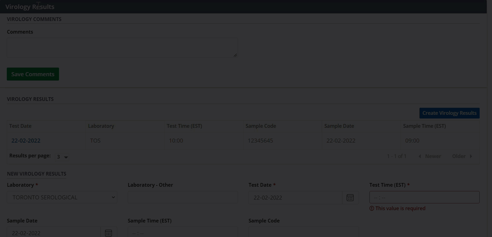 Select any entry from the historical virology results table to see its details in the Selected Virology Result fields.
