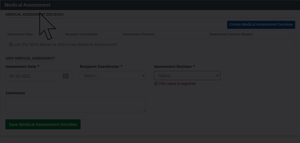 The Assessment Decision field cannot be edited. To log a different decision, select the Create Medical Assessment button.