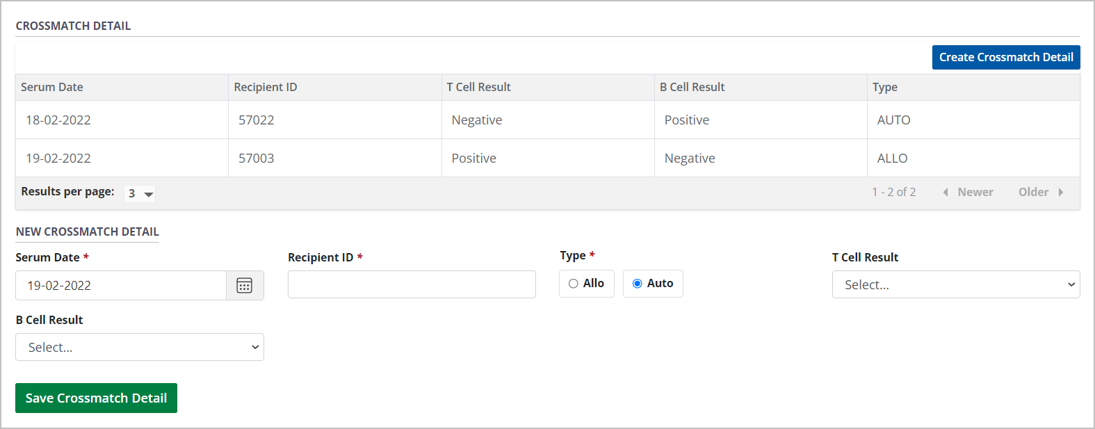 You may enter multiple crossmatch details for each sample; one for each recipient it was tested against.