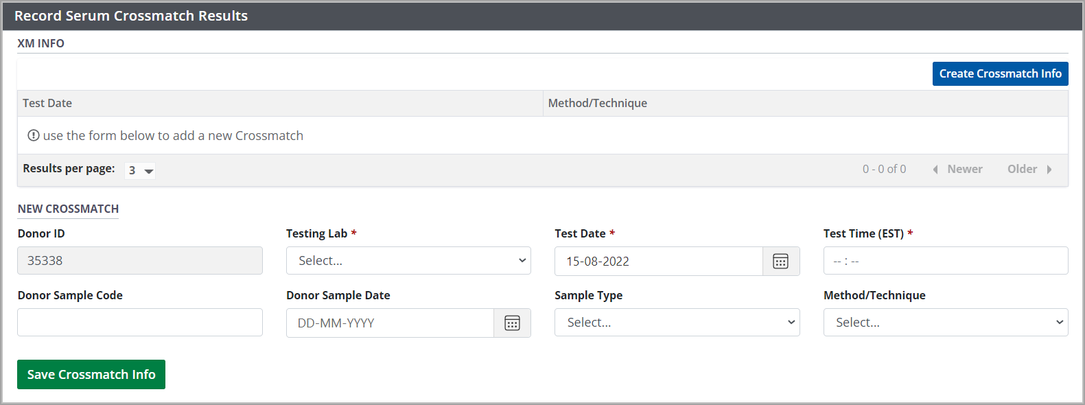 The system adds the new crossmatch test information to the XM Info table at the top of this section. You can now add crossmatch results for recipients.