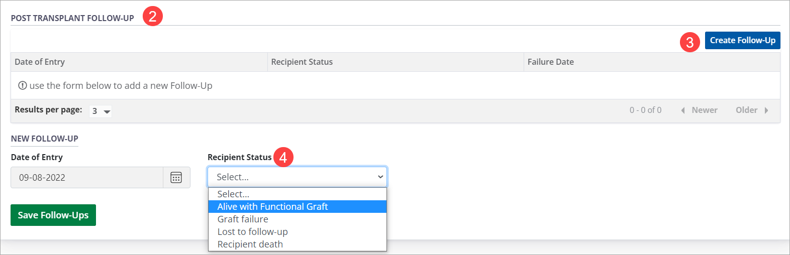 Select Graft failure in the Recipient Status dropdown under New Follow-Up.