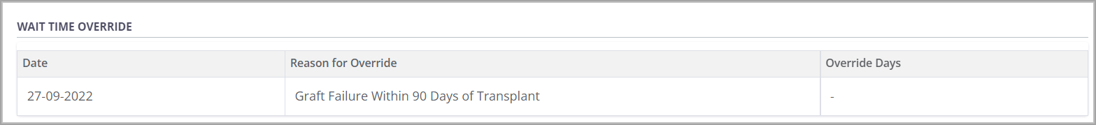 For organs other than kidney and pancreas, or if the kidney/pancreas failure more than 90 days after the transplant, the transplant program can apply to the Special Case Committee for wait to be added to the recipient’s journey. See Apply Wait Time Overrides.