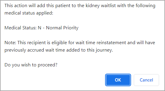 When adding the recipient to the pancreas or kidney waitlist, the system provide a prompt: