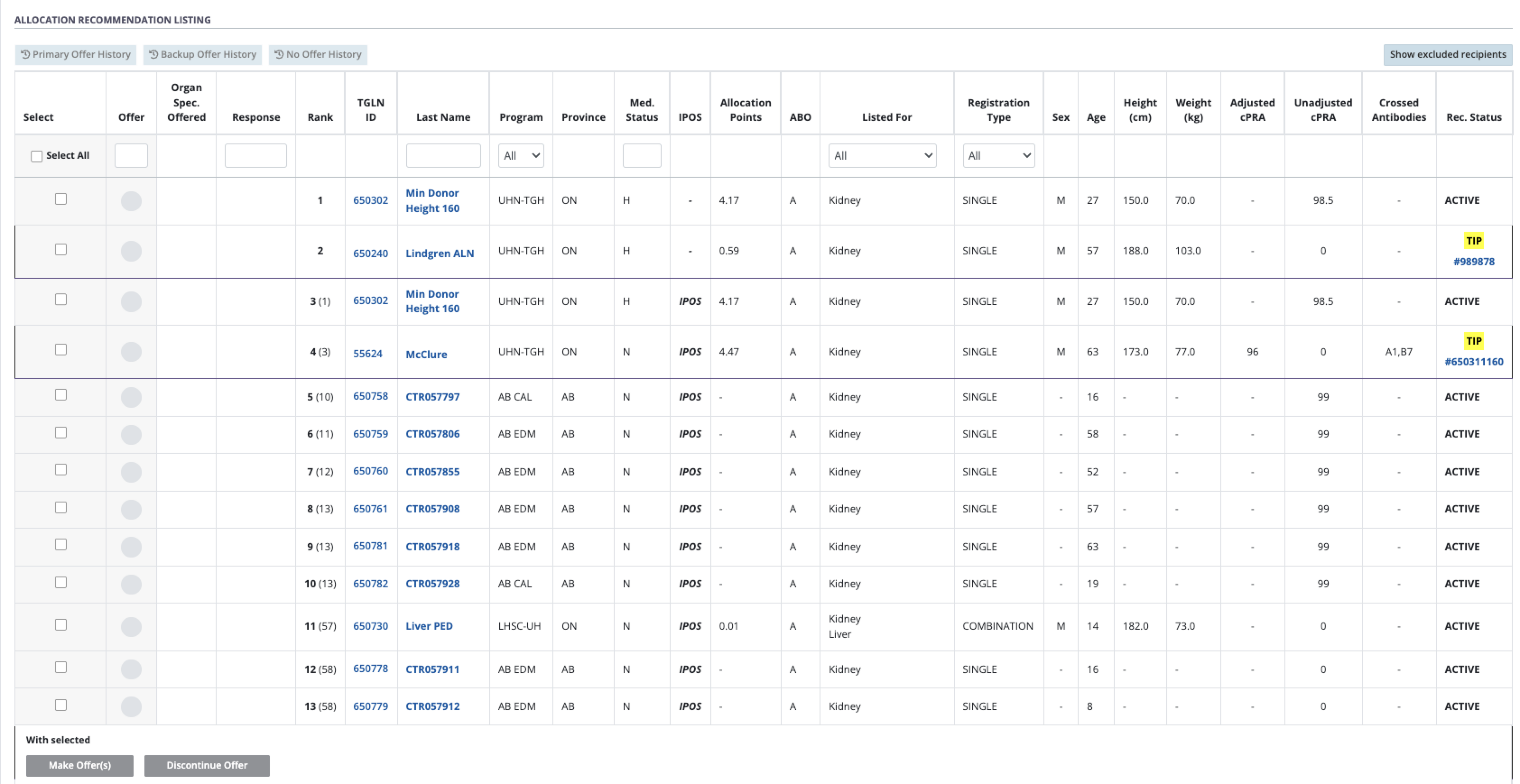 Allocation Recommendation Listing with a ranked list of recipients from the donor’s transplant program.