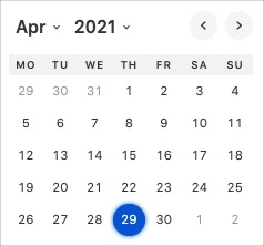 Click the calendar icon to open the date picker tool. Click the Month and Year dropdown lists to select a value, or click the back (<) and forward (>) icons to navigate the calendar by month. Click a day to select it. |